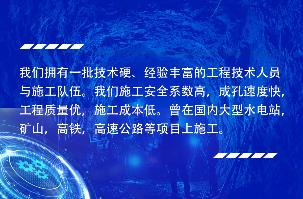 淮北市勤拓礦山工程有限公司是一家從事多年反井鉆機(jī)施工的服務(wù)生產(chǎn)型公司,公司目前有十幾臺(tái)鉆機(jī)設(shè)備,ZFY120/30/150型反井(天井)鉆機(jī)5臺(tái),ZFY1.8/40/250型反井(天井)鉆機(jī)4臺(tái),ZFY2.5/70/200型反井(天井)鉆機(jī)2臺(tái),ZFY3.0/120/400型反井鉆機(jī)1臺(tái),ZFY3.5/120/400型反井(天井)鉆機(jī)1臺(tái),可承接深度0-300米,成孔直,0.9~4米.1.2~3米的各種豎井、井下煤倉(cāng)、溜煤眼、通風(fēng)井、調(diào)壓井、電纜井、泄水井等。我們擁有一批技術(shù)硬、經(jīng)驗(yàn)豐富的工程技術(shù)人員與施工隊(duì)伍。我們施工安全系數(shù)高,成孔速度快,工程質(zhì)量?jī)?yōu),施工成本低。曾在國(guó)內(nèi)大型水電站,礦山,高鐵,高速公路等項(xiàng)目上施工。